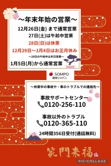 年末年始は遠出することが多くなると思いますが、万が一事故や車のトラブル等がありましたら、お手数ですが損保ジャパンのフリーダイヤルまでご連絡お願いいたします。
